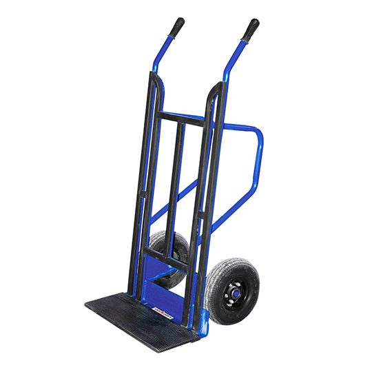 中心偏移的通用型手推車,牢固的鋼質結構,木質表面,手柄和托盤均有橡膠包裹。靜態支持。